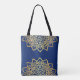 Marinho Elegante Blue Tote Bag com um intricado e falso design de flor Mandala representando o florescimento da Pureza dentro da nossa Alma. O azul representa o céu e o mar e está associado a espaços abertos, assim como lealdade, sabedoria e confiança. Perfeito para uma bela cerimônia feliz de Verão. Você pode mudar o texto do Menu Personalizar para Bridesmaid, Noiva, Mãe da Noiva e Bem-vindo. Design original por SunFreeStar.