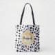 Na moda Dalmaciano mostra um padrão com uma etiqueta falsa de folha de ouro com nome personalizável e modelos monogramas. Um saco de tota com monograma agudo com padrão de manchas preto e branco e elementos de ouro. Para alterar as cores da fonte e os estilos de fonte, clique no botão "personalizar" e clique no botão "personalizar mais".