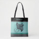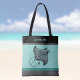 This beach theme tote bag features intricate ink style retro artwork of a manta ray against a light teal green faux brushed metal background. The manta ray is rendered in an intricate, stylized line-drawing technique reminiscent of vintage New Zealand Maori art, giving it a bold and contemporary look. Black, gray, and darker green bands provide a stylish look, and your personalized name appears in light green text on black at the top.