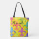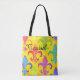 Esta bolsa de tote Mardi Gras apresenta um padrão de arco-íris flur de lis com uma cor amarela. Personalize com seu nome na tipografia negra. Concebido pelo artista mundialmente famoso ©Tim Coffey.