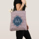 Um elegante saco de tote de padrão de escala arquitetado deco de arte vermelha escura com um marinho crachá azul quatrefoil que você pode personalizar adicionando facilmente seu próprio monograma e nome. Esta é parte da Coleção de Primavera do Sailor Blue Monogramas de Maçã Espicada.
