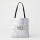 Um elegante padrão de textura de mármore branco está nesta bolsa de tote. No meio do saco você pode personalizá-lo com seu monograma em texto preto. Uma linha de ouro falsa (não em folha) está acima e abaixo das iniciais.