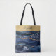 Personalize esta bolsa tote com padrão de ágata azul dourada brilhante com o nome ou iniciais dela. Um presente moderno e elegante para qualquer mulher.