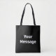 Você pode criar sua própria mensagem em texto branco neste saco de tote preto.
