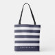 Moderno padrão de listras azuis-marinho e branco, bolsa tote. Personalize com nome e título da comitiva da noiva.