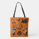 Whether you're heading out trick-or-treating or just toting some horror books home from the library, this monogrammed tote bag is the perfect choice for getting into the Halloween spirit. It features a collage of vintage style Halloween graphics with cats, a bat, a witch, a jack-o-lantern pumpkin and an owl in black and cream set against an orange background. This bag is ready to be personalized with your initials. The design and personalization appears on both sides of this tote bag.