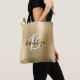 Esta elegante bolsa personalizada de tote apresenta um monograma e primeiro nome em um roteiro preto e branco moderno sobre um fundo de metal escovado em ouro de vidro.