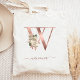 Esta elegante bolsa tote apresenta um grande monograma de letra "W" em folha de falso ouro rosa, decorado com um buquê floral de marfim vintage aparado com folhagem verde e dourada rosa. Personalize-a com o nome dela em escrita à mão em ouro rosa, com floreios no início e no final. É um presente perfeito para damas de honra! Outras letras do alfabeto estão disponíveis em nossa loja Zazzle; se você não encontrar as que precisa, sinta-se à vontade para entrar em contato conosco em weddingpapernest@gmail.com. (Para manter os floreios, substitua apenas as letras do nome.)