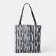 Esta é uma bolsa de tote personalizada elegante e em voga, com fundo de listras de zebra brancas e pretas. O seu monograma está lá, mas não sobrecarrega o design. Ela está localizada no topo da frente, em preto dentro de uma faixa de círculo branca que está alinhada com pontos pretos. A parte de trás do saco tem a mesma design de impressão zebra, mas sem a faixa ou monograma. Muito chique!