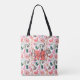 Crie um saco de tote personalizado acentuado com seu primeiro nome em preto sobre um primeiro monograma rosa brilhante e verde sobre um fundo floral cor-de-rosa. Mais designs na nossa coleção.