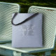 Crie um saco de tote personalizado acentuado com seu primeiro nome em branco sobre um monograma azul escuro inicial sobre um fundo azul empoeirado. Mais cores na nossa coleção.