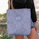 Um saco de tote com um padrão de mandala azul na moda floral com um monograma, um na moda, uma tendência, inicial, com design moderno, elegante, clássico, rosa e roxo, personalizado