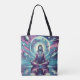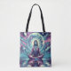 Saco de tote místico. Uma bela e serena ilustração aérea relaxante de uma cena azul e roxa com uma mulher medicando em frente à lua, planetas, estrelas e galáxia para lhe dar uma vibração pacífica. Bonito para uma sala de meditação ou um estúdio de yoga.