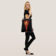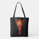 Uma mulher que é uma chama com asas. Uma fênix em chamas vermelhas, amarelas e laranja num pano de fundo de preto.