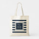 Saco de tota monograma personalizado com iniciais na moda trendy apresentando um padrão listrado marinho azul e branco com suas iniciais e nome da família com a data estabelecida em um quadrado marinho com borda azul com um texto branco clássico. Projetado por Thisnotme©