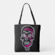 Cor inversa desenho do crânio de Halloween num saco de tote. Caveira desenhada com a arte da linha da cinza clara e realce do néon rosa. Esta camisa de Halloween parece brilhar no escuro. O crânio tem cores personalizáveis. Clique em "Editar Design" para alterar as cores.