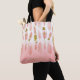 Saco tote boho personalizável com penas de água rosa e acentos de folha dourada falsa e sombreado rosa. Personalize adicionando nomes e outros detalhes. Este saco de penas boho será perfeito como um presente personalizado.