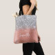 Personalize o script de estilo manuscrito moderno para criar seu próprio saco de compras com um impressão. Adicione uma inicial de monograma para criar uma combinação inicial de nome. Brilhante prateado feminino sobre um pêssego cor-de-rosa ou laranja claro coral com metal esfregado em folha. As folhas, faíscas e reluzentes são a arte digital que vai impressão como uma foto.