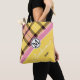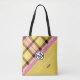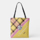 Nome personalizado do script Monograma Chic Tartan Bridesmaid Tote Bag Modern, elegante e na moda personalizável apresenta fundo cor-de-rosa/amarelo de tartan de xadrez, "monograma personalizado" em uma faixa cor-de-rosa de bebê, "bridesmaid" e "nome personalizado" sob fundo amarelo no canto. Personalize esta bolsa adorável como um presente maravilhoso para uma dama de honra adicionando seu monograma, nome ou texto / mudando a fonte, cor, tamanho e posição.