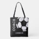 O treinador do futebol personalizado ostenta a sacola preta moderna. Fundo preto com a bola de futebol preto e branco. Treinador escrito verticalmente e sobrenome horizontalmente. Design em ambos os lados. Personalize à cor do fundo da mudança do preto a toda a outra cor. Grande presente para seu treinador do futebol. Esportes do futebol - sacola temático.
