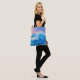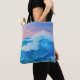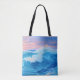 Disparadores azuis rolam em direção a uma praia, enquanto o sol se põe em cores rosa e lavanda. Esta é a bolsa perfeita para qualquer um que ama a praia ou o oceano.