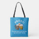 Saco de tota OKTOBERFEST, mostrando três cervejas e PROST! no topo em texto curvo contra fundo azul bávaro. Na parte inferior, o texto PERSONALIZÁVEL lê OKTOBERFEST, e isso pode ser alterado para seu evento ou seu nome, etc. Ideal para carregar de seus itens em comemorações públicas, festivais de cerveja, durante a estação de Oktoberfest, etc. Itens correspondentes também estão disponíveis.