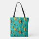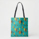 Esta bolsa de tote tem um médio de diamantes atômico moderno século design, e estereótipos em um campo de turquesa.