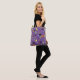 Saca de Halloween fofo e assustador para doces ou travessuras. Fundo roxo com um "Feliz Halloween" colorido, abóbora, fantasma, bruxa, lua, padrão de gato preto.