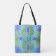 Um design de padrão floral, este saco de totas exibe desenhos de flores em um fundo azul e verde. Confira!