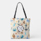 Um saco de tote fofo com um monograma inicial. Um padrão temático tropical de verão cheio de itens da praia. Caranguejos, conchas, estrelas-do-mar e âncoras. Creme e esquema de cor azul.