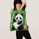 Esta bolsa de tote apresenta um adorável panda sentado numa floresta de bambu. Isso seria um presente maravilhoso para si mesmo, membro da família ou amigo que ama pandas ou animais em geral.