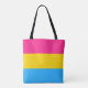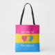 Shopping tote bag with the pansexuality pride flag with little hearts in the center of the design. Pink, yellow, and blue flag of the pan pride movement; with an editable text field for your name or message