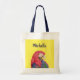 Pássaro tropical personalizou a bolsa de tote, com uma imagem de arara vermelha e verde sobre fundo amarelo. Com a inscrição de script azul, você pode personalizar com seu próprio nome. Excelente para adicionar um toque tropical às suas tarefas ou atividades de férias.