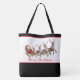 Esta bolsa de tote é mostrada com um favorito de Natal de Papais noeis e seu trenó em voo. Precintas pretas, cintas pretas superiores e fundo preto sobre fundo branco com faixas vermelhas de sotaque. Texto de Feliz Natal em vermelho. Personalize este item ou comprar conforme projetado.
