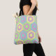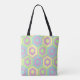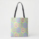 Esta bolsa de tota tem um design geométrico de hexágonos em azul pálido, amarelo pálido e verde pálido num campo de listras em rosa pálido e roxo pálido. Use-o para segurar seus ovos durante sua caçada de ovos na Páscoa.