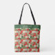 Uma mistura de elementos de Natal, incluindo Papai Noel, Holly, e flocos de neve em vermelho, verde e branco, faz um saco de tote bonito que é perfeito para as férias.