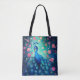 Este belo design apresenta um pavão resistente em bonito tonalidades de azul, verde e laranja, simbolizando a prosperidade e a beleza. Uma bolsa de tote linda para uma declaração. Ao redor do pavão estão flores bonito em tons de rosa.