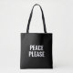 Paz, por favor, texto preto e branco simples e minimalista para protesto anti-guerra. Texto branco personalizado sobre fundo preto de cor sólida. As cores são editáveis. Texto totalmente personalizável em ambos os lados do saco, para que você possa personalizá-lo e torná-lo exclusivo.