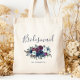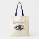 This personalized bridesmaid tote bag features a watercolor bouquet of navy blue and purple flowers. The word "Bridesmaid" appears in elegant navy blue handwriting script. Add her name in navy blue copperplate font.