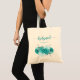 This personalized bridesmaid tote bag features a watercolor bouquet of turquoise flowers trimmed with silver foliage. The word "bridesmaid" appears in elegant turquoise handwriting script with flourishes at the beginning and end. Add her name in turquoise copperplate font.