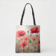 Flores de papoila e botões vermelhos brilhantes num prado ensolarado.