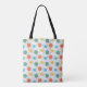 Esta bolsa de tota tem uma design moderna de médio século com círculos atrás em laranja, amarelo, turquesa e verde.