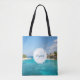 Um saco de tote com uma bela foto com um resort de praia tropical. Bonito água azul e praia branca arenosa com aqueles cabanas que lhe dão uma vibração tranquila na ilha. Um círculo branco colocado sobre o topo com seu nome e dentro inicial monograma.