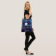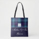 Bolsa tote personalizável elegante e moderna apresenta "nome personalizado & data" em xadrez azul celadão / azul escuro no topo e "mãe do noivo" em fundo azul escuro.
