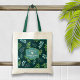 Cute, personalized garden tote in a pretty, blue and green watercolor floral design with a pretty, complimentary dark background.