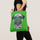 Características deste design um retrato do pug dentro com óculos de sol e um lenço checkered preto e branco.