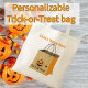 Esta bolsa de tota tem uma fotografia de um truque ou saco de tratamento com uma abóbora e uma aranha sobre ela. É um saco de crianças excelentes. Personalize-o com o nome do seu filho.