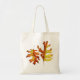 O outono deixa um saco de tota com uma ilustração a tinta e a aquarela, com duas folhas de carvalho amarelo acastanhado. Uma das folhas tem um lado enrolado que se parece com uma mão que dá ao parceiro dançante. Este design de amante da natureza tem um fundo personalizável.