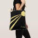 Saco elegante com raios solares sobre fundo preto. Três raios que emergem do sol são três aspectos da vida: corpo, mente e espírito. O texto ensolarado pode ser personalizado.