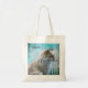 Saco com uma foto de uma raposa fofa sozinha. Colocado sobre um fundo azul de inclinação.